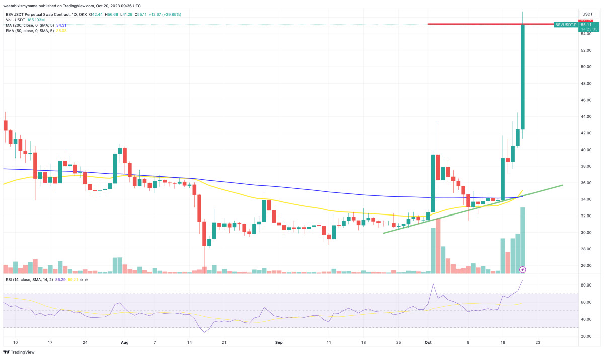 BSV is now up by 65% in a week and by 76% in a month, with the altcoin having gained by 35% since the beginning of the year.